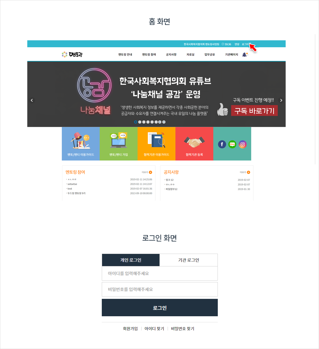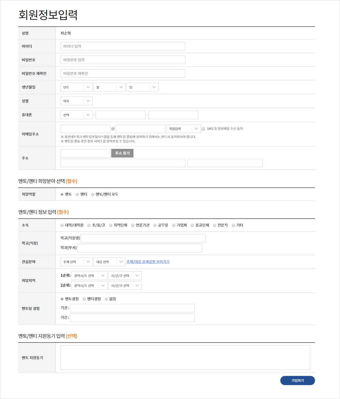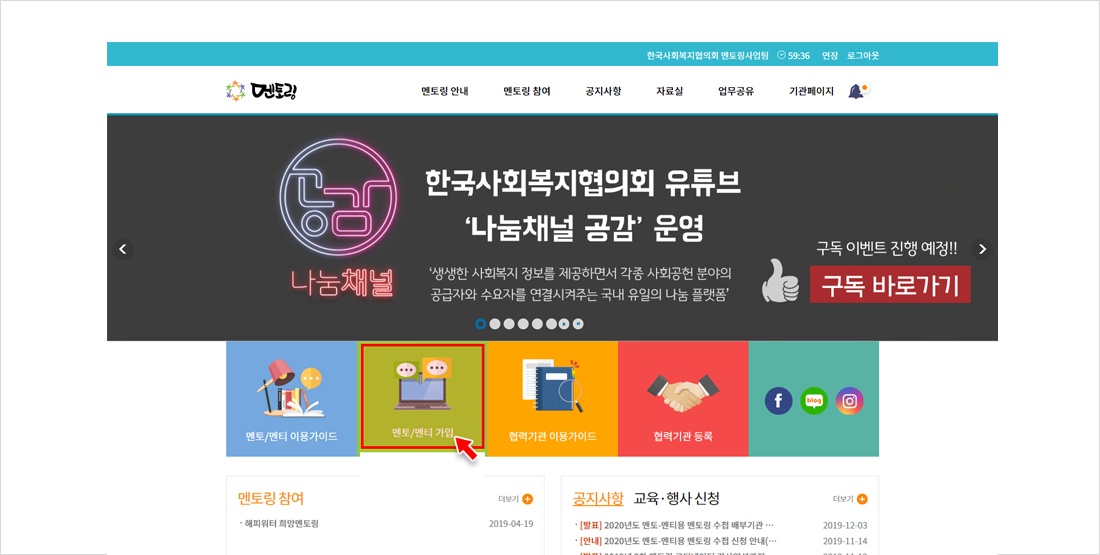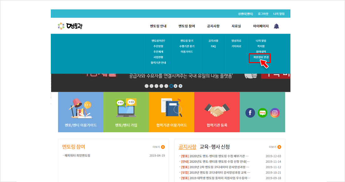 홈페이지 메인화면의 멘토/멘티 가입을 클릭하여 회원가입 페이지로 이동합니다.