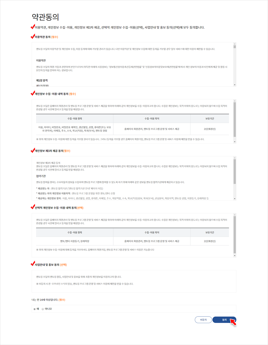 이용약관 및 개인정보 수집 동의 내용 확인 후 동의합니다(“예”) 선택 후 [동의합니다] 버튼을 클릭하여 다음 단계로 이동합니다.