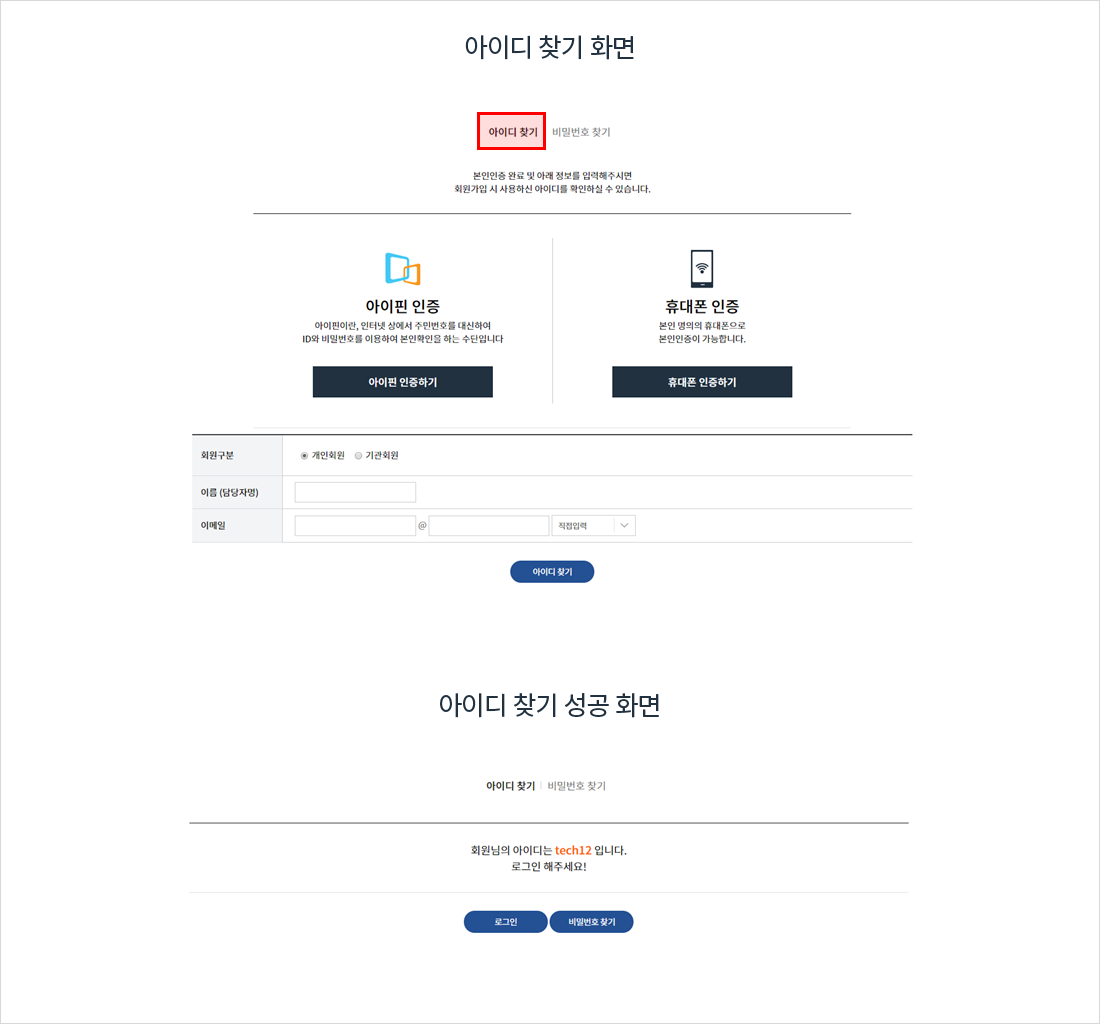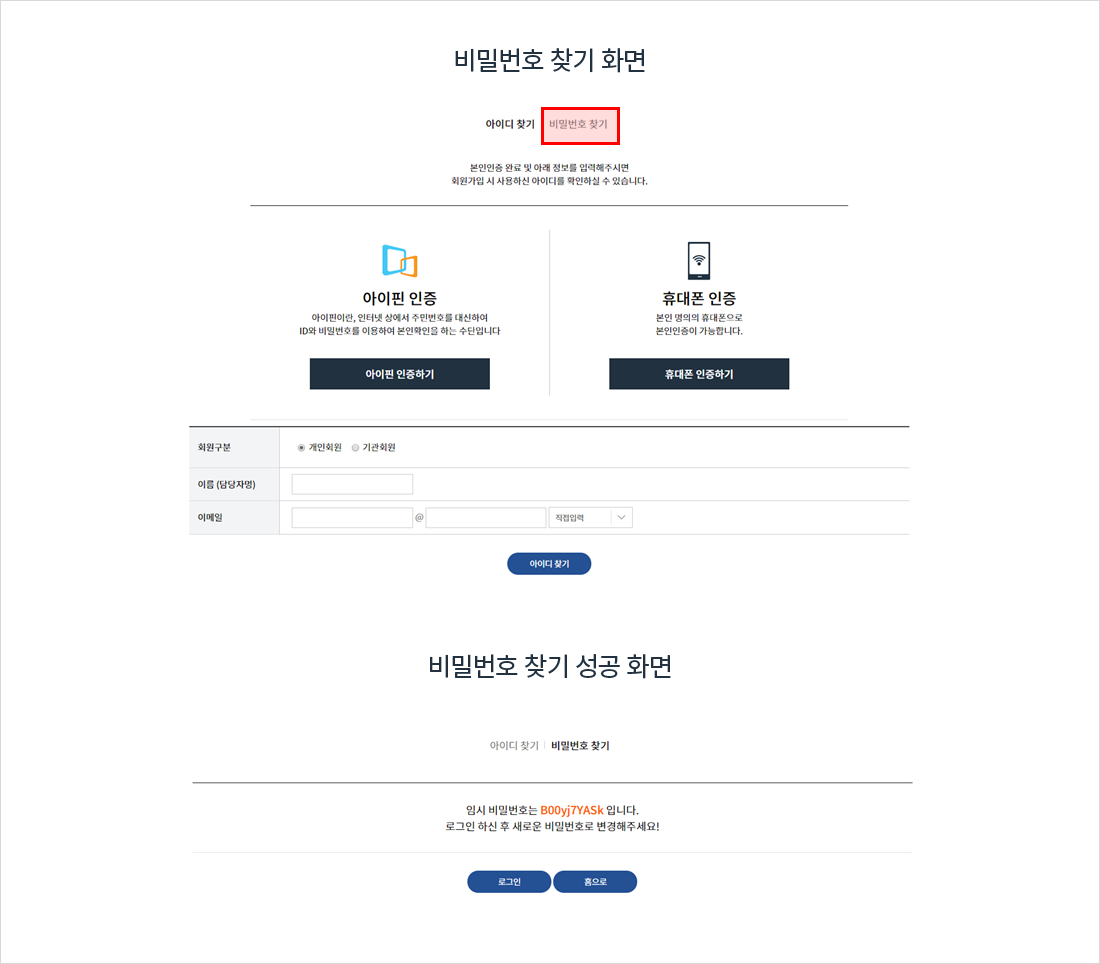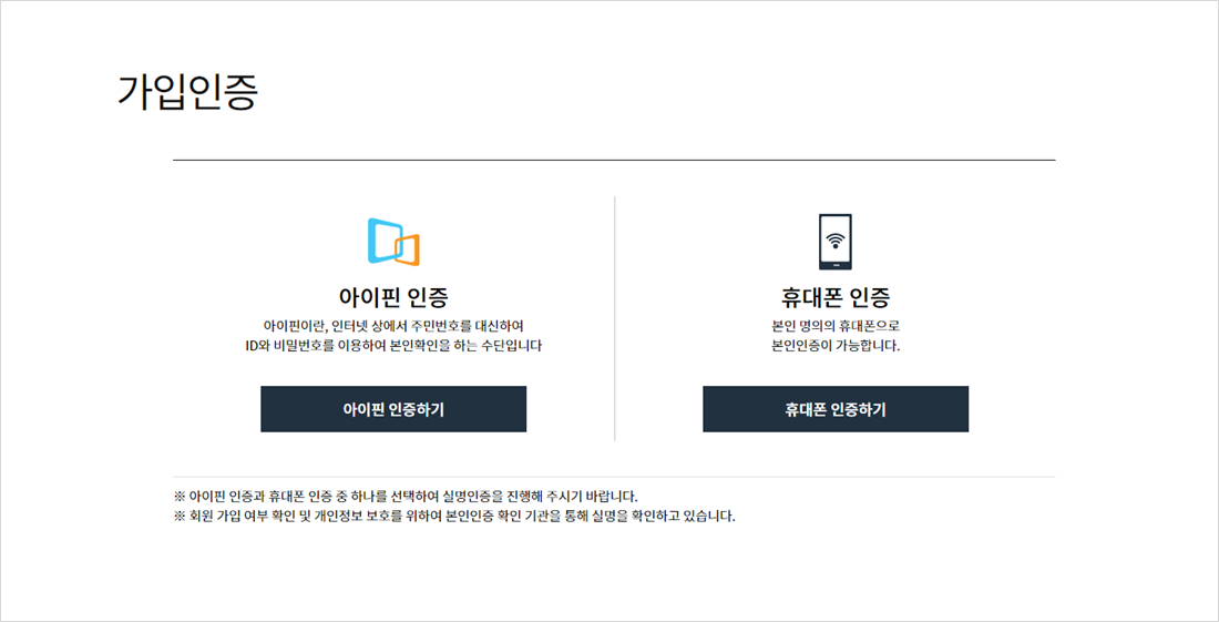 휴대폰 인증 또는 아이핀 인증을 선택하여 본인인증 절차를 거칩니다.