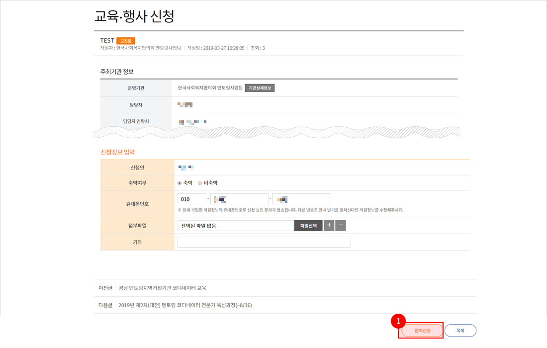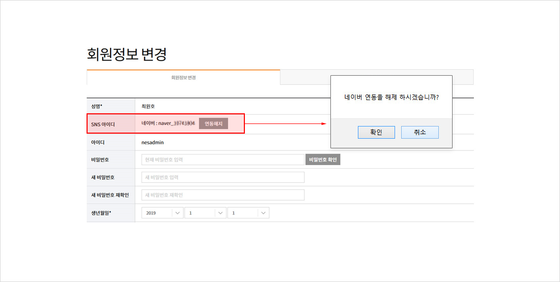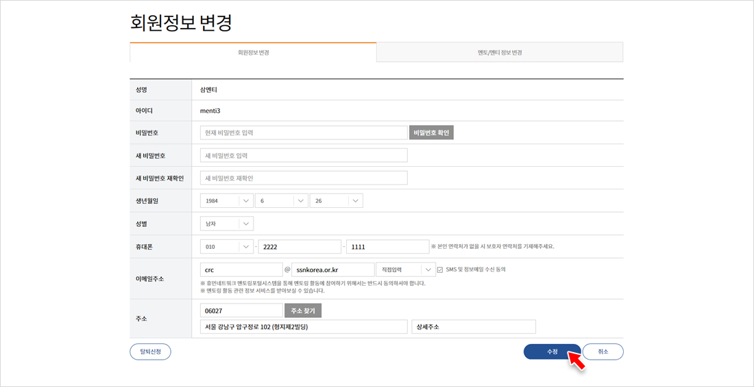 아이디, 비밀번호, 연락처 등의 회원가입 정보 입력 후 [확인] 버튼을 클릭합니다.
